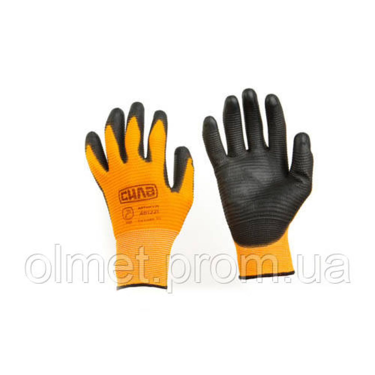 Рукавички з ПУ-покриттям р10 (жовтогарячий + чорний манжет) СІЛА